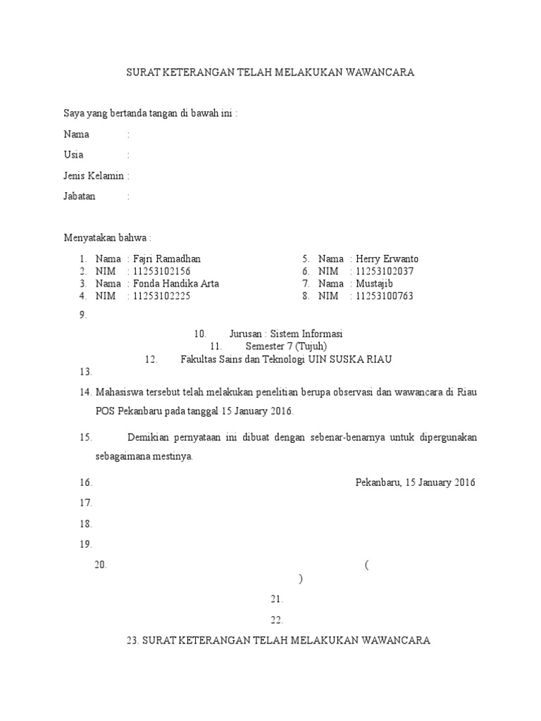 Contoh Surat Pernyataan Wawancara Skripsi / Makalah Id Dalam Melakukan Sebuah Pembelian Sebuah Barang Yang Memiliki Harga Yang Mahal Seperti Halnya Motor Tentu Kita Membutuhkan Sebua Surat Tanda Berita - 8 contoh kuesioner penelitian skripsi kepuasan pelanggan dll yang.. Karena untuk memperoleh data diperlukan, peneliti menggunakan teknik wawancara, yaitu menggunakan tanya jawab langsung dengan calon pengantin mengenai masalah yang diteliti dengan. Tujuannya adalah agar tidak merugikan kedua belah pihak seandainya pernyataan yang disampaikan merupakan kebohongan atau tidak ditepati. Contoh surat ini biasanya digunakan oleh mahasiswa sebagai pengantar surat permintaan magang disebuah perusahaan pada saat praktek kerja lapangan (pkl). Lembar pernyataan keaslian diperlukan untuk menunjukkan keaslian suatu karya bahwa karya tersebut bukan plagiat. Ada banyak contoh surat pernyataan yang biasanya banyak digunakan, mulai dari surat pernyataan belum menikah, surat pernyataan diri.