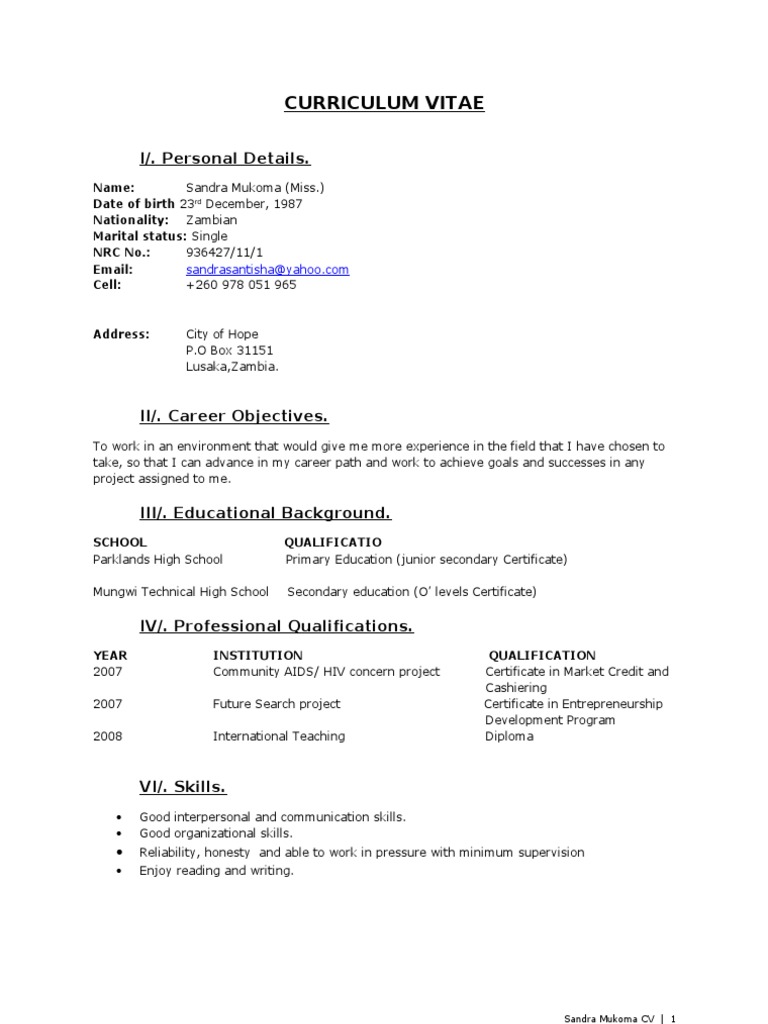 Worry less about making it flashy but more about making it easy to read. If you aren't sure where to start with your own cv, take a look at our administrative assistant cv example. The heading of a cv should be the candidate's full name written in large, bold letters and centred on the page (not curriculum vitae or cv). A letter of application should complement, not duplicate, your cv. Correct spelling, consistent formatting, readable font style and size (11 pt. Essay writers for hire are professionals example of a curriculum vitae in zambia who have made it their career to example of a curriculum vitae in zambia write essays and give essay writing help to anybody who badly needs it. How to write a job application letter in zambia. We write essays for money: There was no way i could do it how to write an application letter as a teacher in zambia in time. It does not matter how long it is taking you to write it or how pretty it is, the employer will take a few seconds to form an opinion, so the first impressions really do count. It leaves us presently equipped to tackle even the most extraordinary writing tasks. Curriculum vitae important note • there is not really a right way to do a cv. 123 fake street, city, state, zip code.